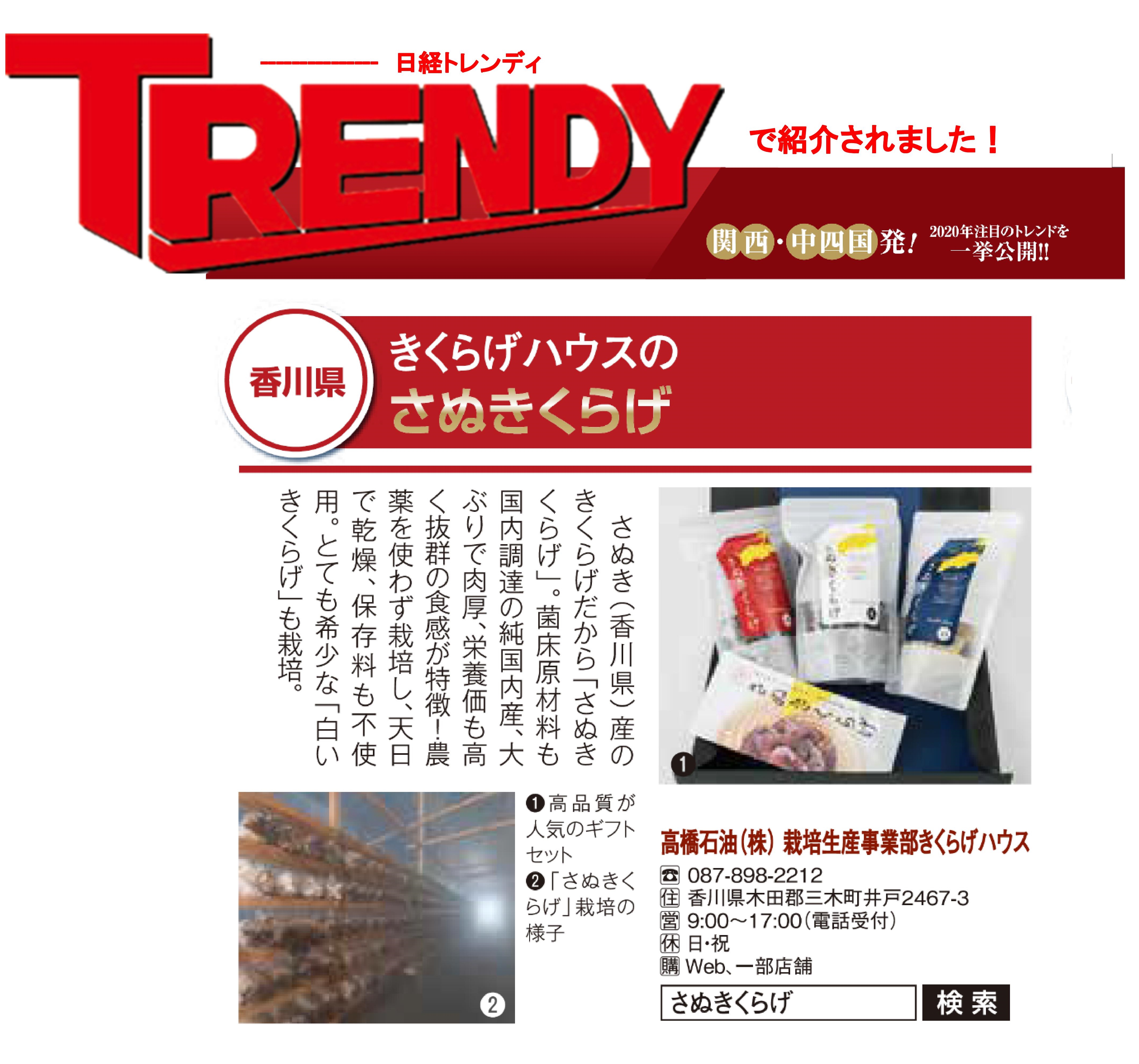 2020年5月4日発売の日経トレンディに「さぬきくらげ」の紹介記事が掲載されます。